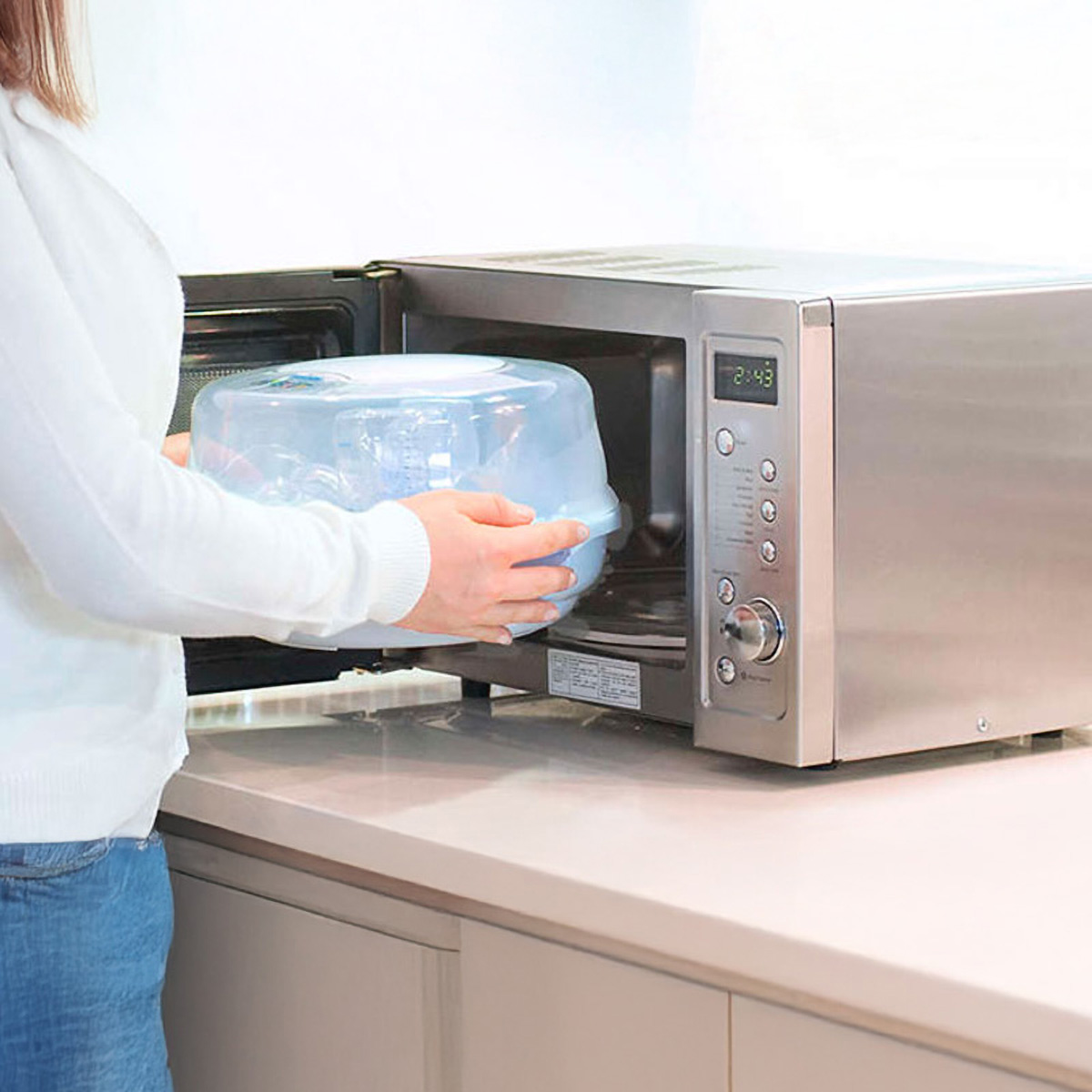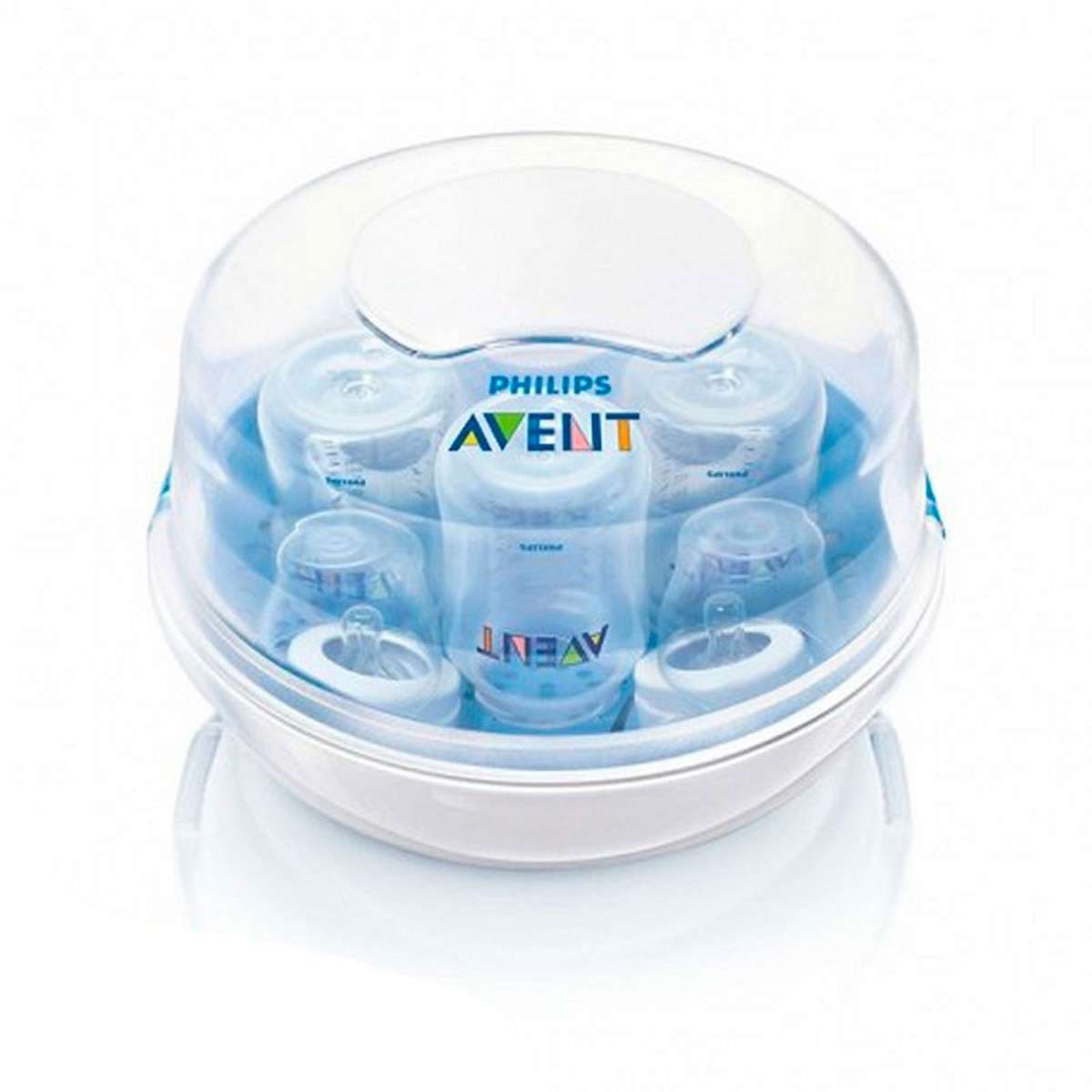 Rápido esterilizador a vapor para el microondas El esterilizador a vapor para el microondas de Philips Avent es una excelente elección para esterilizar rápida y eficazmente dentro o fuera de casa. Se puede esterilizar hasta 4 mamaderas o productos Philips Avent de una vez y mata el 99,9% de los gérmenes en solo 2 minutos.