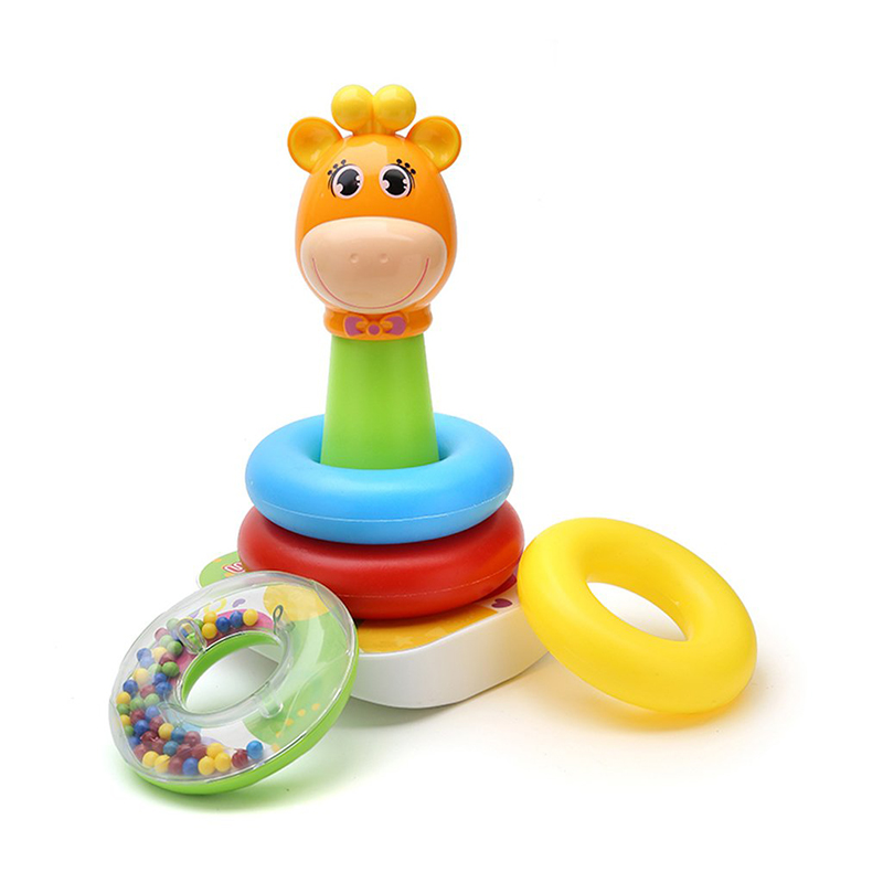 Dos modelos diferentes con simpáticas cabezas de animales: oso o jirafa * Cuatro coloridos anillos para agarrar, agitar y apilar * El anillo superior contiene coloridas pelotitas en su interior que producen ruido al agitarlo * Base tambaleante que se balancea de un lado a otro al empujarlo * Edad recomendada de uso: +6 meses * Material: PVC * BPA free – Libre de ftalatos