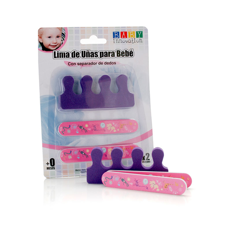Lima de uñas con separador de dedos – Línea de puericultura para bebés Baby Innovation * Disponible en dos colores: rojo/amarillo y violeta/rosa * Cuenta con un separador de dedos para mayor precisión * Motivo alegre y divertido * Materiales: acrílico y E.V.A. * BPA free – Libre de ftalatos