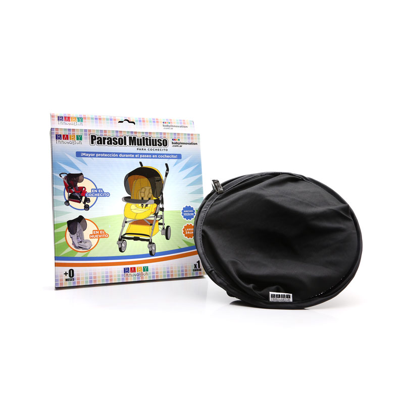 Parasol adaptable para huevito y cochecito – Línea de paseo en cochecito Baby Innovation * Tamaño extra grande para mayor protección de los rayos del sol: 102 x 34 cm. * Universal y adapatable gracias a sus marcos flexibles y sus clips de sujeción segura que permiten ajustarlo y fijarlo según la necesidad * Adapatable a cochecitos y huevitos * Mantiene intacta la visión del niño durante el paseo al aire libre * Materiales: PET y alumnio * BPA free – Libre de ftalatos