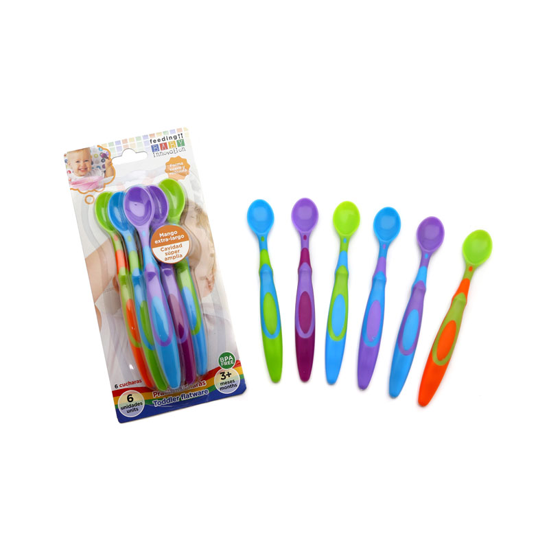 Seis coloridas cucharas de mango extra largo y amplia cavidad – Línea de alimentación para bebés Baby Innovation * Diseño innovador con puntas redondeadas y profundas * Mango extra largo que se adapta a la mano para porporcionar que el niño comience a comer solo * Ideales para compartir * Material: PVC * BPA free – Libre de ftalatos