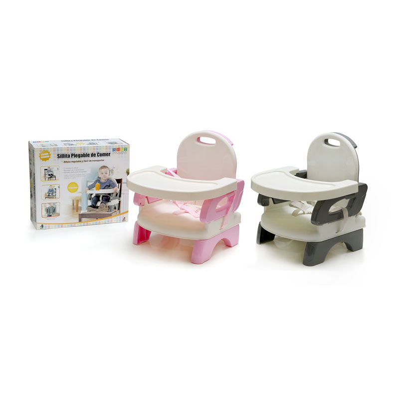 Asiento para comer adaptable a las sillas de adulto – Línea de alimentación para bebés Baby Innovation * Disponible en dos colores: gris y rosa * Soporta hasta 15 kg. * Plegable, con manija incorporada y fácil de trasladar * Cuenta con una práctica bandeja desmontable y adaptable a las sillas de adultos * Dos alturas regulables para mayor comodidad * Edad recomendada de uso: +6 meses * Materiales: PVC * BPA free – Libre de ftalatos