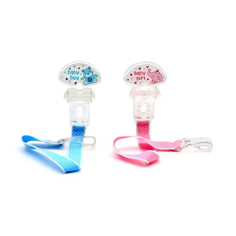 Sujetador de Chupete para evitar caídas y pérdidas – Línea de puericultura para bebés Baby Innovation * Disponible en dos colores: celeste y rosa * Evita que el chupete se caiga o se pierda * Fuerte clip sujetador de plástico Premium que no daña la ropa * Materiales: PVC * BPA free – Libre de ftalatos