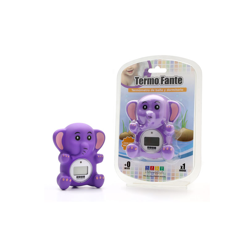 Termómetro de agua y ambiente – Línea de baño para bebés Baby Innovation * Apto para bañadera y dormitorios * Dos diseños: celeste y violeta * Amigable diseño de elefante * Con visor digital de temperatura y alarma para cuando el agua se encuentra muy caliente * Funciona a pilas (incluidas) * Materiales: PVC * BPA free – Libre de ftalatos