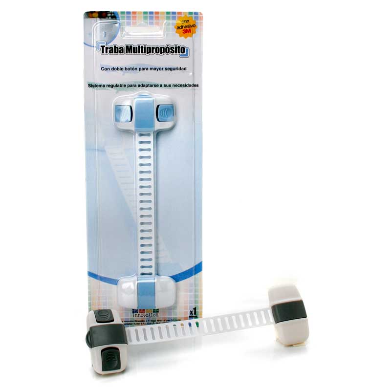Traba para heladeras, inodoros y otros – Línea de seguridad para bebés Baby Innovation * Disponible en ters colores: gris, celeste y verde * Traba ajustable y adaptable a diversos artefactos y muebles * Fácil de colocar * Práctico sistema de apertura de doble botón * Incluye adhesivo 3M * Material: PVC * BPA free – Libre de ftalatos