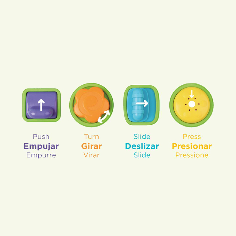 Dos modelos diferentes: en color verde y blanco * Tiene coloridas palancas y botones para empujar, girar, deslizar y presionar * La interacción con cada botón y/o palanca activa la salida de un colorido animalito * Con control de encendido y apagado, y de funciones: luces y juego / sonidos y música * Edad recomendada de uso: +12 meses * Materiales: PVC * BPA free – Libre de ftalatos
