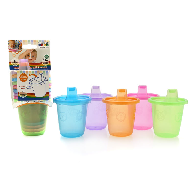 Cinco coloridos vasos apilables con practi-tapas anti-derrames – Línea de alimentación para bebés Baby Innovation * Fáciles de usar y de transportar * Diseño innovador que facilita la sujeción * Diseño innovador con pico anti-derrame * Motivos alegres y coloridos para atraer la atención del bebé * Ideales para usar en todo momento y lugar * Materiales: PVC * BPA free – Libre de ftalatos