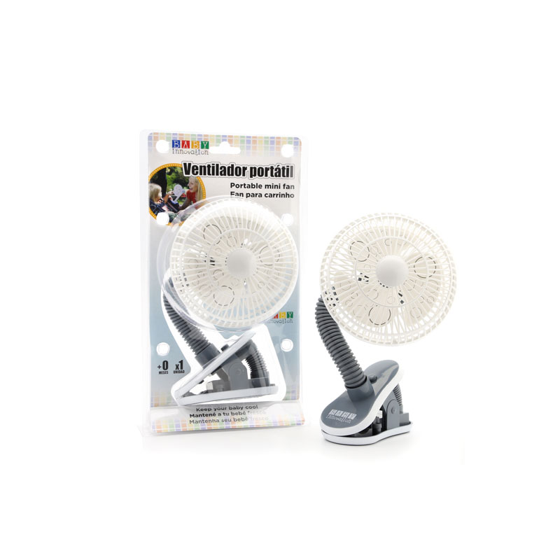 Ventilador a pila para bebes – Línea de paseo para bebés Baby Innovation * Ideal para mantener fresco al bebé en los paseos al aire libre en días de temperaturas elevadas * Ranuras cerradas para evitar accidentes * Sujetador extra-fuerte para mayor seguridad * Cuello flexible para ajustarlo fácilmente * No incluye pilas * Materiales: PVC * BPA free – Libre de ftalatos