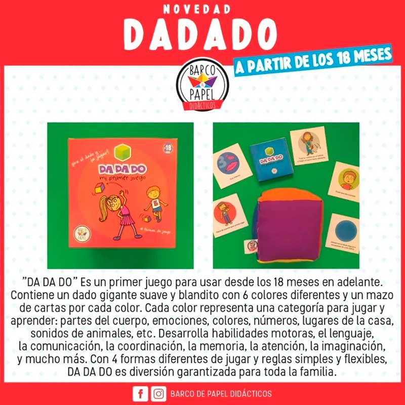 Un primer juego para usar desde los 18 meses en adelante. Contiene un dado gigante suave y blandito con 6 colores diferentes y un mazo de cartas por cada color. Cada color representa una categoría para jugar y aprender: partes del cuerpo, emociones, colores, números, lugares de la casa, sonidos de animales, etc. Desarrolla habilidades motoras, el lenguaje, la comunicación, la coordinación, la memoria, la atención, la imaginación, y mucho más. Con 4 formas diferentes de jugar y reglas simples y flexibles, DA DA DO es diversión garantizada para toda la familia.