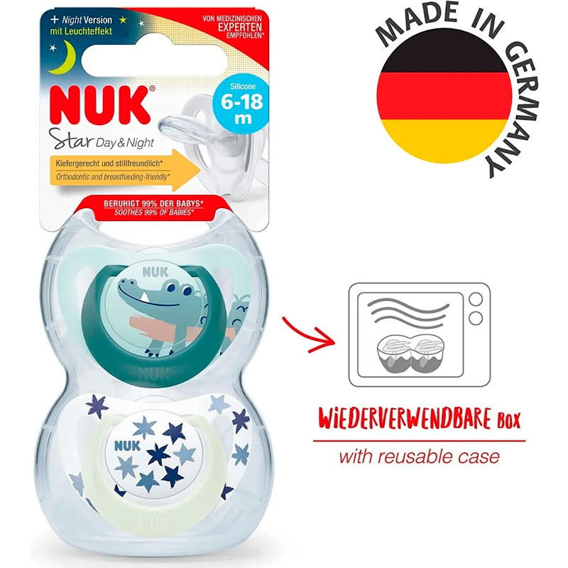 NUK – Chupete Star Day & Night X2 c/estuche Cocodrilo Verde T2 – 736783